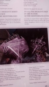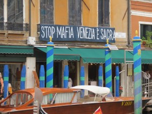 my mind. Random odd memories keep popping up, like the used sanitary pad (fortunately not bloody) on the stairway as we entered the Vatican museum (a strange juxtaposition if ever there was one!) and the banner at Venice railing against the Mafia, and the touching notice up in the main square of San Gimignano, showing solidarity to the poor immigrants who are currently risking life and limb to flee to safer shores (possibly the very same who we see playing cat and mouse with the police at the border here, if they’re lucky enough to get this far, or the fake watch/bag/jewellery/junk sellers who were chased around Venice by the police there in another little dance of who is powerful and who is not. )