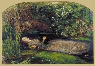 The painting of Ophelia mentioned in the book is by Sir John Everett Millais. The scene is from Shakespeare’s Hamlet, Act IV, Scene vii, in which Ophelia, driven out of her mind when her father is murdered by her lover Hamlet, drowns herself in a stream.